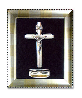 Cruz art?sticamente dise?ada en Silver Plate enmarcada en fino cuadro plateado acompa?ada de incrustaci?n de Tierra Santa de Jerusal?n y Agua Bendita del R?o Jord?n. Fino y delicado regalo con alto valor simb?lico. Medidas: 22 cm.
